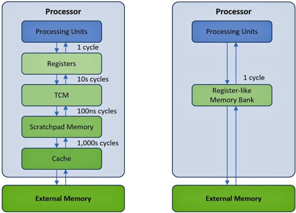 A purpose-built inference architecture should discard caches entirely and instead use huge, directly addressed register-like memory arrays with index-based access instead of address-based lookup. This allows deterministic access latency and constant-time delivery of operands. Aim for tens or even hundreds of millions of bits of on-chip register storage, positioned physically close to the compute cores to fully saturate their pipelines (Figure 1).
