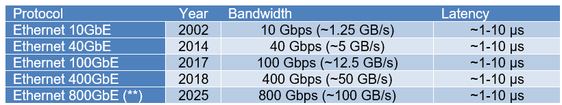 The evolution of Ethernet has been even more dramatic. Ethernet standards, particularly those supporting speeds up to 10 Gbps, have undergone more than a dozen amendments in the past five years alone, with the rate of updates accelerating. Ultra-Ethernet, currently under development by the Ultra Ethernet Consortium (UEC), which includes leading companies in AI and networking like AMD, Intel, and HPE, is specified to support transfer speeds of up to 224 GB/sec. For context, this is nearly twice the speed anticipated from PCIe Gen 7 and positions Ultra-Ethernet as a direct competitor to Nvidia’s NVLink[i], which offers a bandwidth of 480 GB/sec.